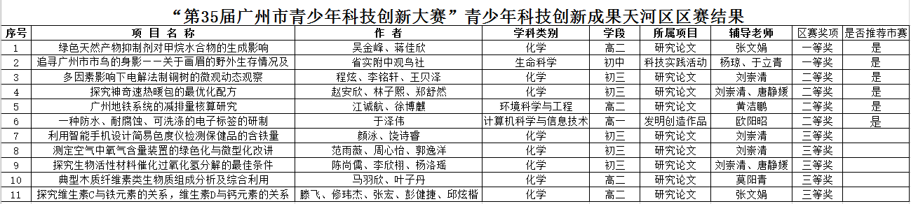 第35届广州市青少年科技创新大赛天河区初赛于2019年10月-11月在广州中学举办。经过两周的评选与学生问辩复评工作,我校共有11个师生作品脱颖而出,一等奖2个,二等奖4个,三等奖5个,其中有6个项目获得参加广州市市赛的推荐名额。同时,我校张文娟、杨琼、于立青三位老师被评为第35届广州市青少年科技创新大赛天河区赛优秀辅导老师,我校被授予第35届广州市青少年科技创新大赛天河区优秀组织奖称号。