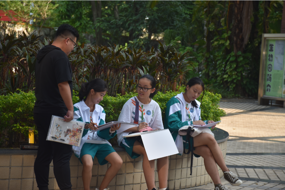 黄小彬老师说,本次课程的知识点是透视的运用和空间的表达,对于初一新生来说是颇有难度的新知识。他采取分段教学的方式,先在课室讲解理论和示范,然后带学生外出实践写生,并悉心指导,取得了良好的教学效果。