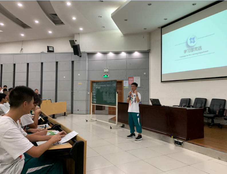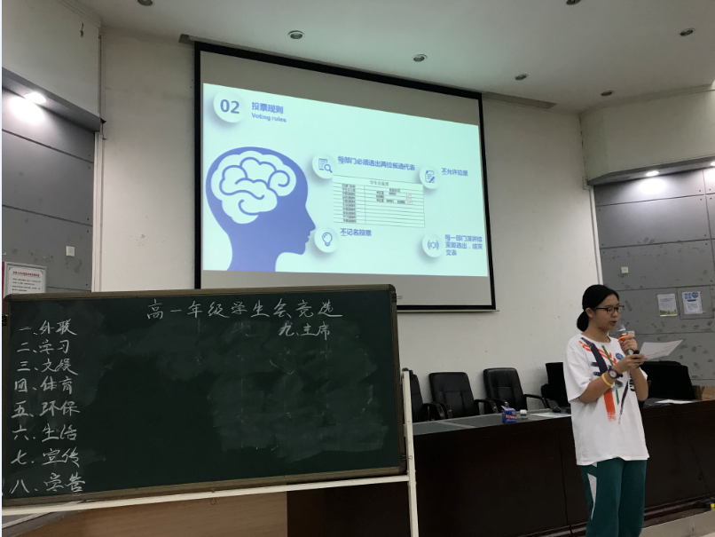 活动伊始,在主持人介绍选举流程、投票规则以及对年级干部的期望之后,各部门候选人轮流上台做简短演讲,展示自己的实力,以及当选后的施政纲领和目标。每一位候选人都拿出自己最好的状态争取选票,有的以自己的过往经验来打动老师和同学们,有的展示自己胜任此职位的优势所在,有的尽力表达自己的诚意以及胜选后的规划,有的认认真真准备好演讲稿,有的则幽默风趣现场发挥,还有的同学霸气十足以自己独特的控场方式来“说服”老师和同学们……