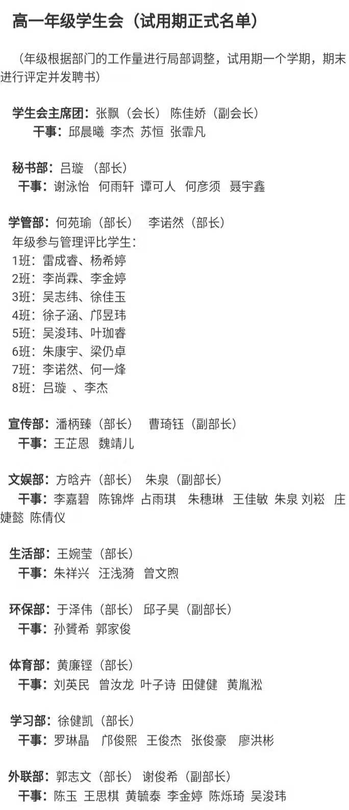 此次高一年级学生会选举,为我校学生会注入新鲜血液,也为更多同学提供了锻炼自己能力的机会,更为以后学生工作有序开展奠定了基础,圆满结束。