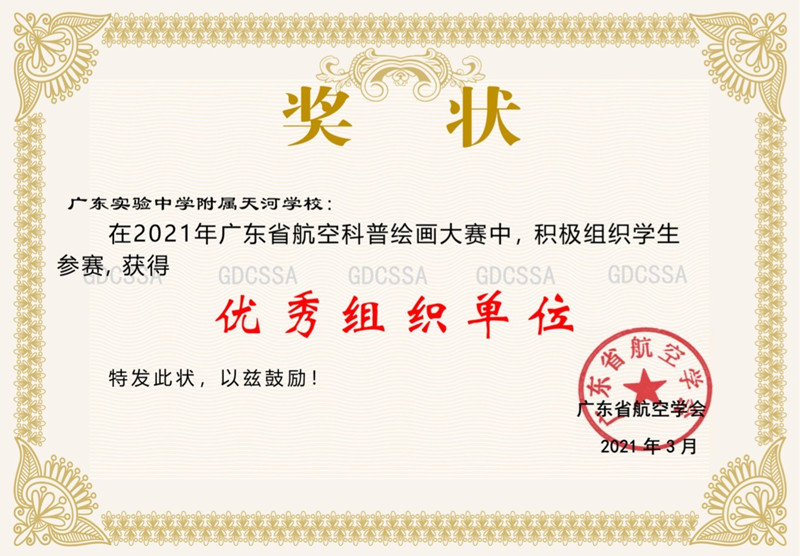 2020年10月,广东省航空学会和广东科技报社联合举办了广东省航空科普绘画大赛,我校美术课组教师组织学生参赛并喜获佳绩:荣获一等奖2名,二等奖4名,三等奖6名;我校获得优秀组织单位荣誉称号;黄小彬老师荣获优秀辅导老师奖。