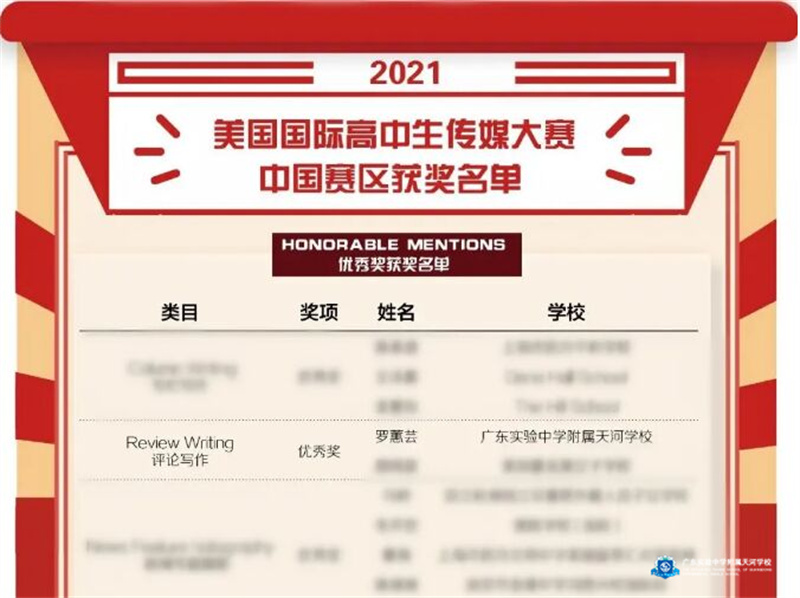 年美国国际高中生传媒大赛中,罗蕙芸同学的作品《评论写作》脱颖而出,获得中国赛区优秀奖。指导老师:钱海燕、王思佳。