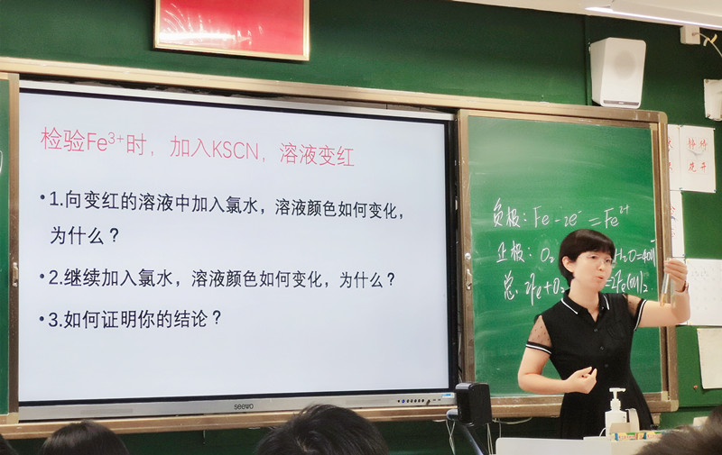 吕晓霞老师评课:这节《暖宝宝使用前后成分的探究》课,巧妙设疑,层层深入,将暖宝宝打开前后的成分展示给学生,并设计成分检验,探究铁离子和亚铁离子的转化关系和检验方法。引导学生分析暖宝宝成分中的干扰物质对核心物质检验的影响,提升学生的思维能力和解决问题的能力。本节课落实具体的“宏观辩识与微观探析”的化学学科核心素养的要求,渗透“双核“思想”,学生课堂参与度高,学会了应用所学化学知识解决生活中的问题。