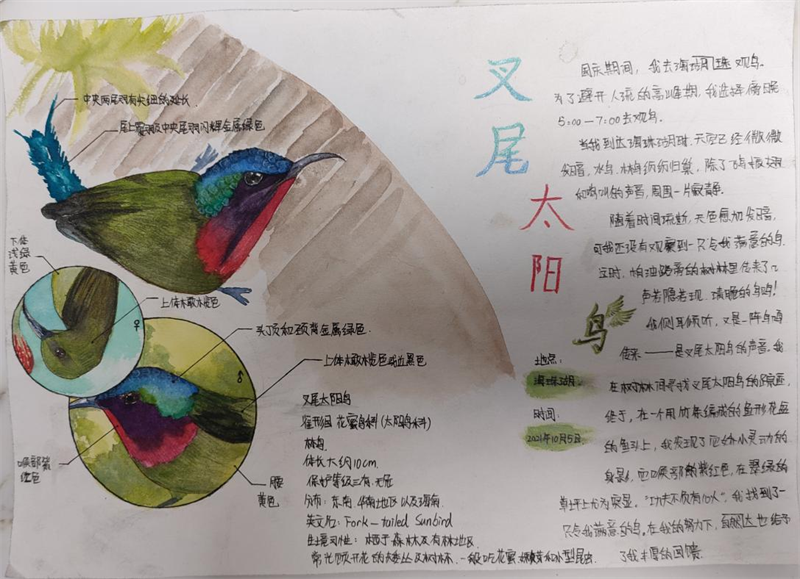 在2021年广佛肇中小学自然观察实践与理论知识教育活动中,我校观鸟社表现出色,荣获数项殊荣,展现了天省少年的风采。其中,在“自然笔记”比赛中获奖16项,包括4项一等奖,7项二等奖和5项三等奖;在“鸟与自然”海报演讲比赛中荣获2项团体一等奖和1项最佳视频奖。此外,观鸟社社长梁世昊同学还获得了2021年优秀科普使者称号。生物科刘雪玲老师、莫海珠老师、邹丽华老师、贾晓霞老师荣获优秀指导老师称号。