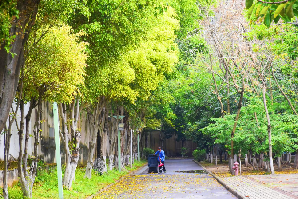 秋之校道,宁静、沉着、厚重、沉稳、踏实地伴着我们走向期末。天上的云朵不再轻佻,阳光也失去了往日的浮躁,只是化为一粒粒的碎金,透过叶间的孔隙,点缀着校道。不是“塞下秋来风景异”的悲凉,也不是“大漠孤烟直”的苍莽,更非“无可奈何花落去”的无奈,却也够不着“回首向来萧瑟处”的豁然,只是那么沉浸,沉静,那么令人心旷神怡。