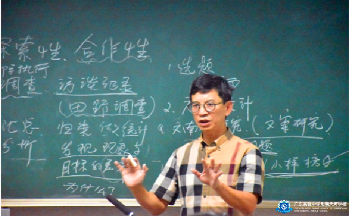 袅袅秋风起,最美人间秋。9月27日下午,广东实验中学附属天河学校创办人、2019级英才班班主任莫道明教授,在电教室为高一、高二英才班学生上了一堂生动实用的《中学生怎么做课题研究》讲座,吸引了很多老师前来“蹭课”。莫道明教授援引个人经历告诉大家,熟练掌握课题研究的方法,运用这项技能性“工具”,可以帮助处理工作中遇到的很多问题,可以让人受益一生。他把一项完整的课题研究分为三个步骤:选题、方案设计和成果演示汇报。