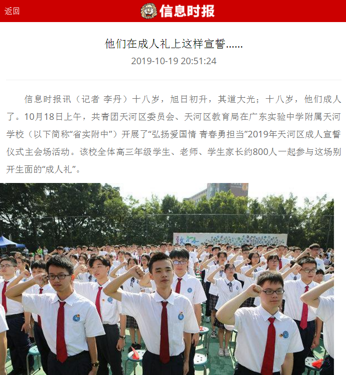 信息时报讯(记者 李丹)十八岁,旭日初升,其道大光;十八岁,他们成人了。10月18日上午,共青团天河区委员会、天河区教育局在广东实验中学附属天河学校(以下简称“省实附中”)开展了“弘扬爱国情 青春勇担当”2019年天河区成人宣誓仪式主会场活动。该校全体高三年级学生、老师、学生家长约800人一起参与这场别开生面的“成人礼”。