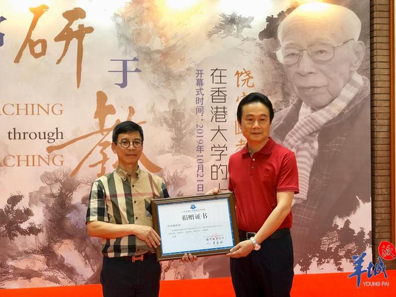 随后,饶清芬女士向图书馆捐赠了《饶宗颐书道创作汇集》著作一套十二册,莫道明教授代表学校表示感谢,并回赠了自己所著的《重读》一书。饶宗颐图书馆名誉馆长陈韩曦还向图书馆捐献一批图书,包括其所著的《饶宗颐诗词评注》一套及其它相关著作共九种,并接受了莫道明教授颁发的收藏证书。
