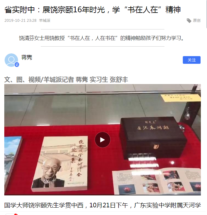 这次展览分为教学、研究及交游三个主要部分,展示饶教授在香港大学的十六年间,是如何通过教研及国际学术交流活动,由香港走向世界,成为一位蜚声国际的学者,对当时乃至往后的国际汉学界产生巨大影响。这既是省实附中“将中学教育和国际大学教育作自然架设和联通”的一次有益尝试,也是高中“英才班”开启国际化文化学习和交流的一个小小的开端。自2015年饶宗颐图书馆落户省实附中(全国唯一一所以饶宗颐先生命名的图书馆)以来,先生的治学经历、治学方法及治学态度不断激励着学生们脚踏实地,努力学习。