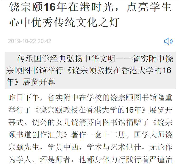 昨日下午,省实附中在学校的饶宗颐图书馆隆重举行了《饶宗颐教授在香港大学的16年》展览开幕式。饶公的女儿饶清芬向图书馆捐赠了《饶宗颐书道创作汇集》著作一套十二册。国学大师饶宗颐先生,学贯中西,学术与艺术俱佳,无论作为学人、还是师者,他都身体力行践行着严谨治学、为师孜孜、以及对于中国传统文化精要的弘扬。