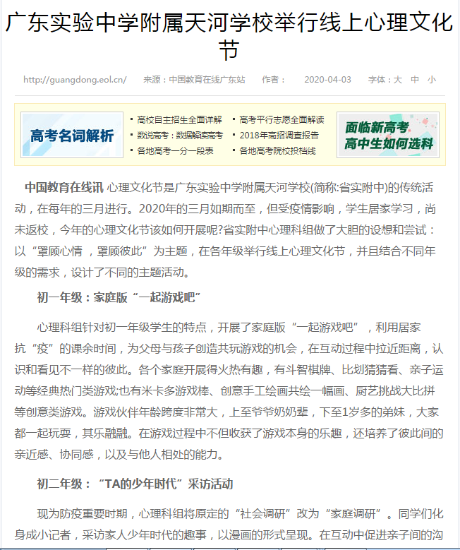 中国教育在线讯 心理文化节是广东实验中学附属天河学校(简称:省实附中)的传统活动,在每年的三月进行。2020年的三月如期而至,但受疫情影响,学生居家学习,尚未返校,今年的心理文化节该如何开展呢?省实附中心理科组做了大胆的设想和尝试:以“罩顾心情 ,罩顾彼此”为主题,在各年级举行线上心理文化节,并且结合不同年级的需求,设计了不同的主题活动。