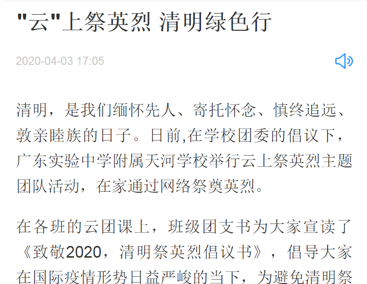 清明,是我们缅怀先人、寄托怀念、慎终追远、敦亲睦族的日子。日前,在学校团委的倡议下,广东实验中学附属天河学校举行云上祭英烈主题团队活动,在家通过网络祭奠英烈。
