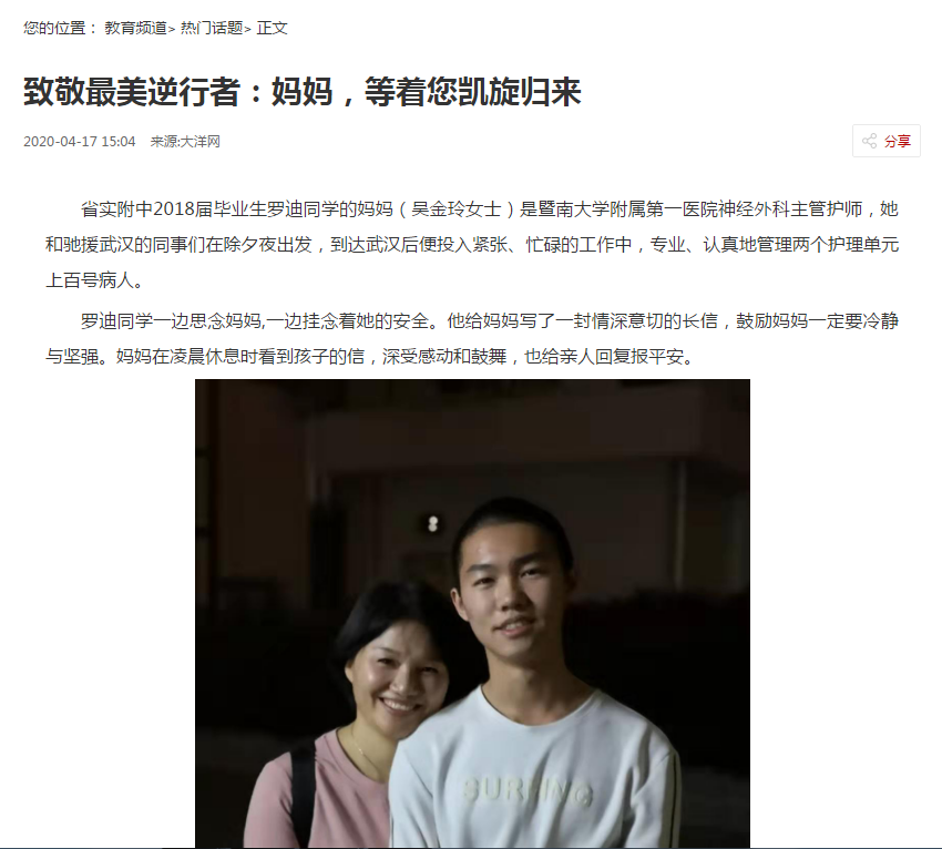 省实附中2018届毕业生罗迪同学的妈妈(吴金玲女士)是暨南大学附属第一医院神经外科主管护师,她和驰援武汉的同事们在除夕夜出发,到达武汉后便投入紧张、忙碌的工作中,专业、认真地管理两个护理单元上百号病人。