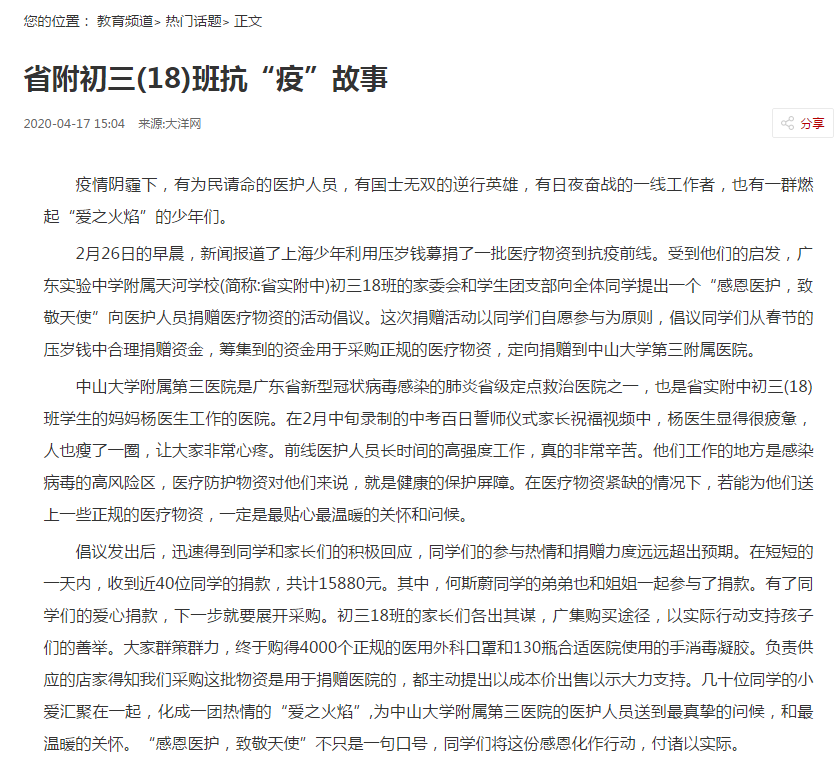 2月26日的早晨,新闻报道了上海少年利用压岁钱募捐了一批医疗物资到抗疫前线。受到他们的启发,广东实验中学附属天河学校(简称:省实附中)初三18班的家委会和学生团支部向全体同学提出一个“感恩医护,致敬天使”向医护人员捐赠医疗物资的活动倡议。这次捐赠活动以同学们自愿参与为原则,倡议同学们从春节的压岁钱中合理捐赠资金,筹集到的资金用于采购正规的医疗物资,定向捐赠到中山大学第三附属医院。