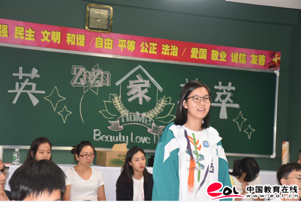 杨艳婷:什么是家国天下?莫老师在班会课上把“家”“国”“天下”的概念从古到今细细地梳理了一遍。作为新一代的青少年学生,如何能够站在更高的角度宏观地看待全球化的世界局势,如何更有效地完成振兴中华的使命,不仅仅要了解经济贸易方面的知识,更要知晓历史进程的方向,这样才能更准确地预测未来的发展走向。