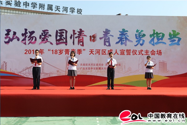 中国教育在线讯10月18日上午,共青团天河区委员会、天河区教育局在广东实验中学附属天河学校开展“弘扬爱国情 青春勇担当”2019年天河区成人宣誓仪式主会场活动。天河区人大常委会副主任陈少龙、天河区人民政府副区长饶洁怡、天河区政协副主席王亚平、共青团天河区委员会书记刘华、天河区教育局副局长王建辉、共青团天河区委员会副书记王沫,广东实验中学附属天河学校常务副校长黄冬玲、党总支书记兼副校长钟民及全体高三年级学生、老师、学生家长约800人出席了本次活动。