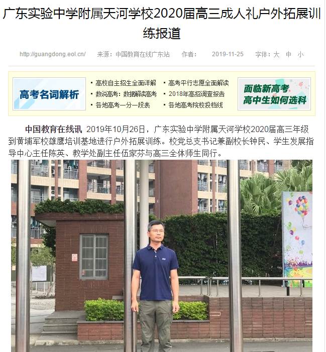 中国教育在线讯 2019年10月26日,广东实验中学附属天河学校2020届高三年级到黄埔军校雄鹰培训基地进行户外拓展训练。校党总支书记兼副校长钟民、学生发展指导中心主任陈英、教学处副主任伍家芬与高三全体师生同行。