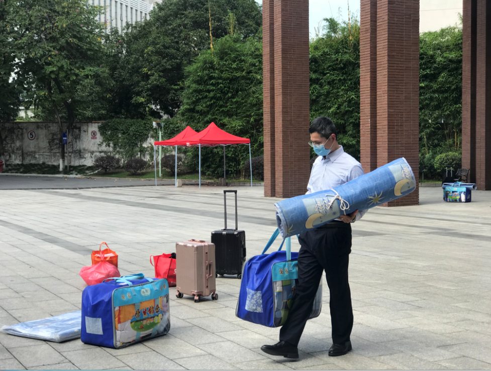 学校“最硬核”搬运天团,校长、主任、老师、物业人员齐上阵,协助同学们将行李放置到“行李区”。专业健康指导员和校医“坐镇”分诊处,为体温异常的同学进行复检。
