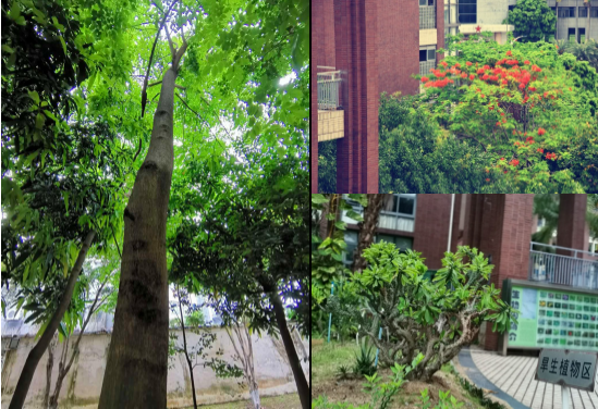 初夏的阳光明媚又火辣,点亮了省附校园暗红色的砖墙,两颗古老的榕树伸出头来,绽放着翠绿的笑意。踏进校园,一排排亭亭玉立的树木迎风而立,姿态各异,有小叶榕、棕榈树、细叶榄仁、紫薇、紫檀等高大乔木,也有杨桃、梨树、莲雾、黄皮、人参果、黄花梨种种果树。细叶榄仁树干挺拔,树冠层次分明,随风飘逸,姿态优雅;棕榈树树干笔直笔直的,远看就像是一把大伞;小叶榕叶片绿得发亮,很像是油画上浓墨重彩泼上去的颜料……校园广场和校道周边覆盖着草坪和绿苔,与高大的树木浑然一体,层次分明,颇具园林气象。