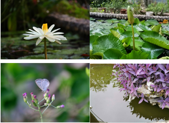 生物园曲水流觞,碧绿的荷叶挤挤挨挨,像一个个圆盘,又像一柄柄撑开的伞。绿荷半开,如娇羞的少女一般亭亭玉立。一条条红色小鱼儿在荷叶间游来游去,攸忽又不见了踪影。