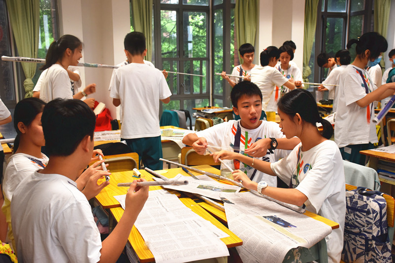 本届科技节最大亮点是做到了让每一个学生都参与到具体的活动中来。比如全校项目“报纸叠高塔”活动,先是每个班分小组制作,然后挑选出本班最高的作品参与年级的评选。短短的30分钟,五张报纸,经过激烈的头脑风暴,在各小组同学的共同努力下,以各种富有创意的姿态呈现了在大家面前。全校最高的“报纸塔”高度为3.5米,是初二12班同学的杰作。