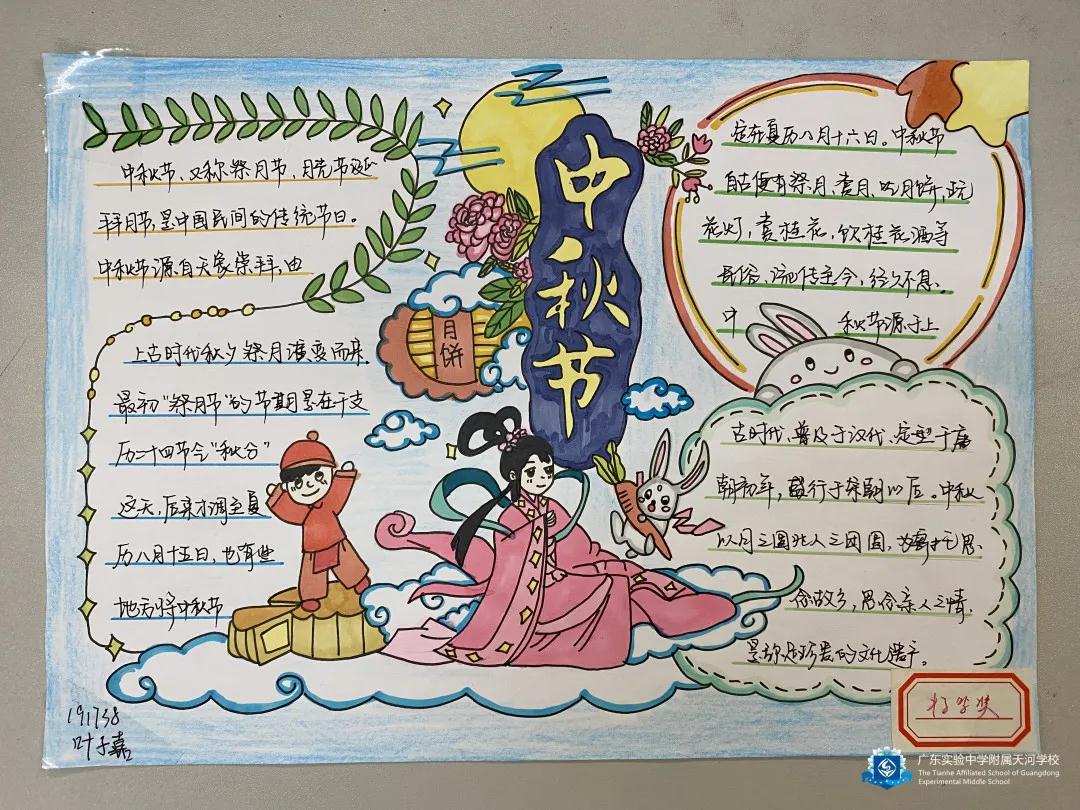 利用课余时间,同学们以小组为单位,制作了中秋主题手抄报。经过同学们的分工协作,用心绘画,最后呈现出了一幅幅精美的拥有浓厚中秋元素的手抄报,给大家带来了一场视觉盛宴。 在收集资料和素材过程中,同学们还对中秋的习俗、来历、神话传说等有了更深刻的了解,同时能尝试亲自体验中秋的传统活动,增添了节日的浓厚气氛;更积累到了许多千古名句,使中秋多了几分诗情画意。