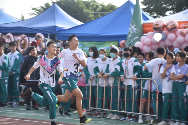 全校3000余名师生参加此次盛会。数百名运动员按照年级分为四组,参加4*200米接力赛金、银、铜牌的角逐。参赛选手们在裁判的一声令下,像离弦的箭一样向前冲去,引得围观的师生尖叫不已。红白跑道上硝烟弥漫,选手们个个奋勇争先,各班大本营的拉拉队挥舞着手臂,大声为本班参赛选手呐喊助威,田径场热闹非凡。