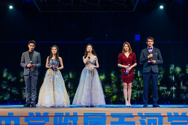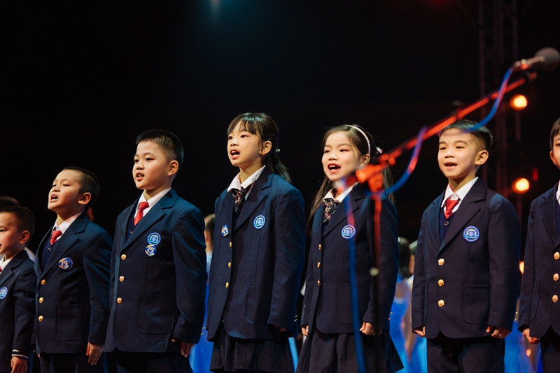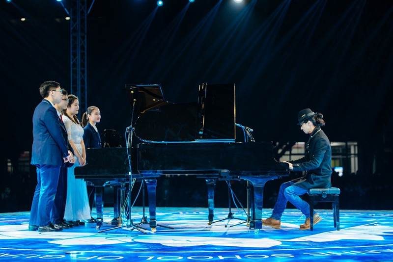 晚上20:00整,文艺晚会正式开始。5位主持人分别用西班牙语、英语、普通话、粤语、汕头话五种语言向大家问好,学校创办人莫道明教授和广东实验中学校长全汉炎先生鸣鼓开场。激情澎湃的中国鼓表演、悠扬婉转的小提琴独奏、温暖有力的学校合唱团大合唱、神秘新奇的管乐团《哈利波特与火焰杯》表演、音乐家方奕带领省附学子双钢琴即兴变奏表演、热情洋溢的街舞、颇有创意的原创歌曲,呈现出一个完美的舞台,燃爆了夜幕下的田径场。而学校合唱团和一群活泼可爱的孩⼦们(教职工子女)一起唱响《我和我的祖国》,更是唱响了省附人的家国情、奋⽃梦。学校还为每一位坚守岗位15年的老师们颁发了创业奖。