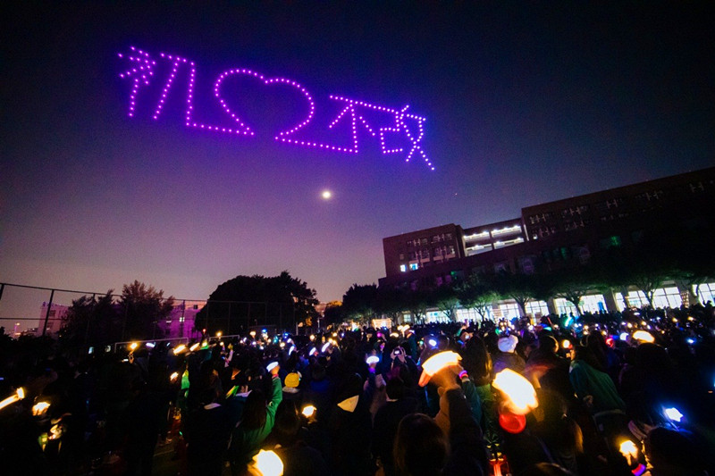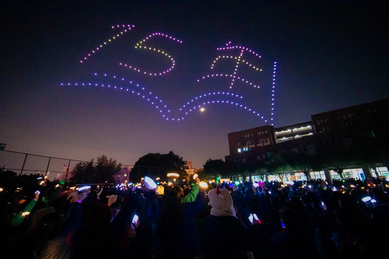 最后,200台无人机缓缓飞上夜空,璀璨如烟花,在田径场上空不停变幻成 “生日快乐”“我爱省附”“15年”等形状,这个富有创意、特色和亮点的礼物,让所有人翘首仰望,尖叫和欢呼不绝!大家点燃手中的生日灯,齐声高唱“祝你生日快乐……” 把喜庆的气氛引向高潮。