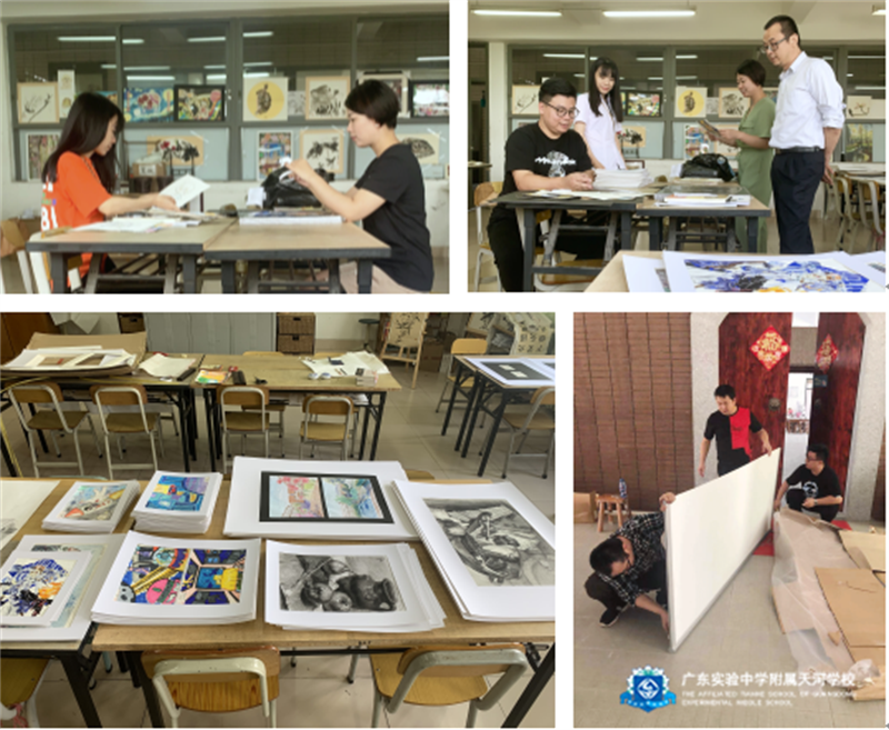 为了保证展览的顺利进行,美术科老师们的准备工作做得十分仔细,从前期作品的收集、挑选、装裱到展板的购买、安装、放置,都是亲力亲为、一丝不苟。最终,一百来幅优秀作品从上千幅作品中脱颖而出,参加展览。