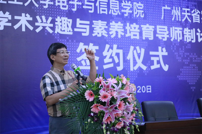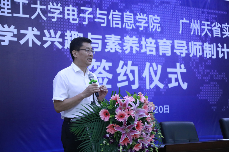 活动一开始,我校杨琼副主任介绍了“华南理工大学(电子与信息学院)——广州天省实验学校学术兴趣与素养培育导师制计划”的有关情况,广州天省实验学校董事长莫道明先生、华南理工大学(电子与信息学院)薛泉院长、广州天省实验学校彭建平校长分别就此次合作发表讲话。随后,华南理工大学(电子与信息学院)与广州天省实验学校进行隆重的签约仪式。