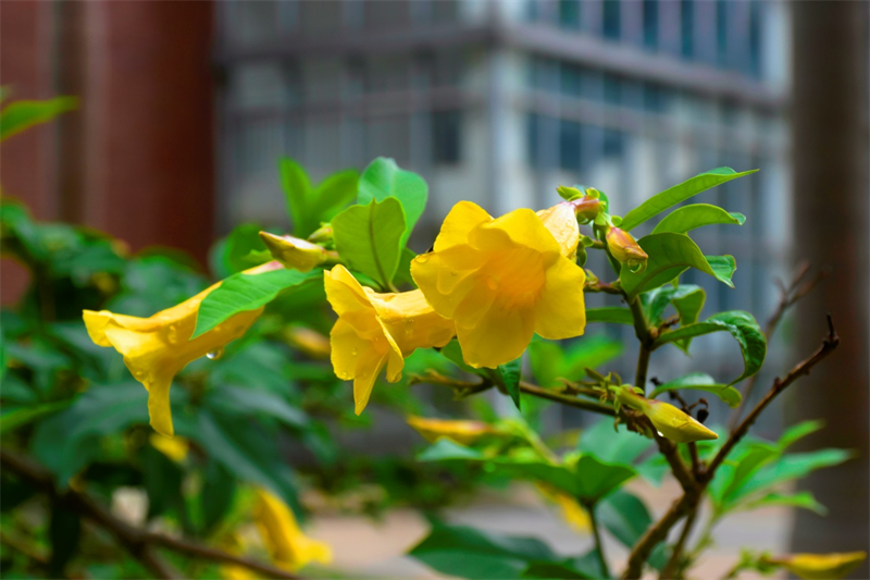 教学楼下黄婵花开,像一只只黄色的小喇叭,热烈、明快,吸引了学生来到树下写生。